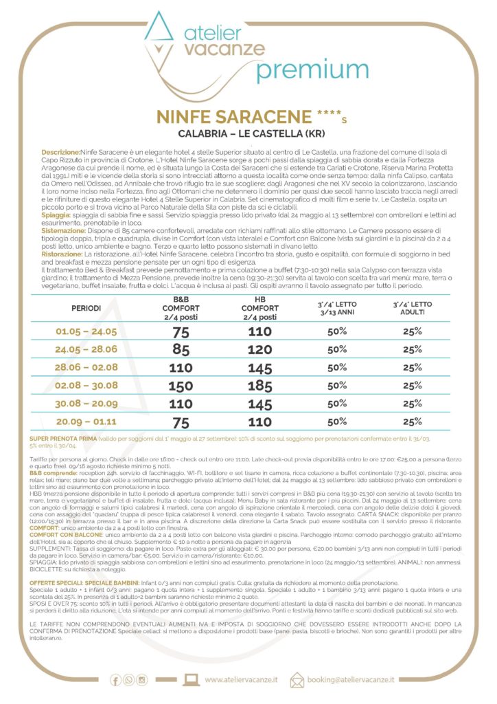 Calabria – L’hotel Ninfe Saracene sorge lungo la bellissima Costa dei Saraceni, i cui fondali sono Area Marina Protetta, al centro della località che prende il nome dall’antica fortezza e a pochi passi da una incantevole spiaggia di sabbia dorata, sorge l’elegante