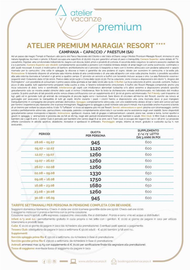 Campania – L’Atelier Premium Maragià Resort , immerso nella natura rigogliosa del Cilento , tra mare e pinete occupa una superficie di 25.000 mq.